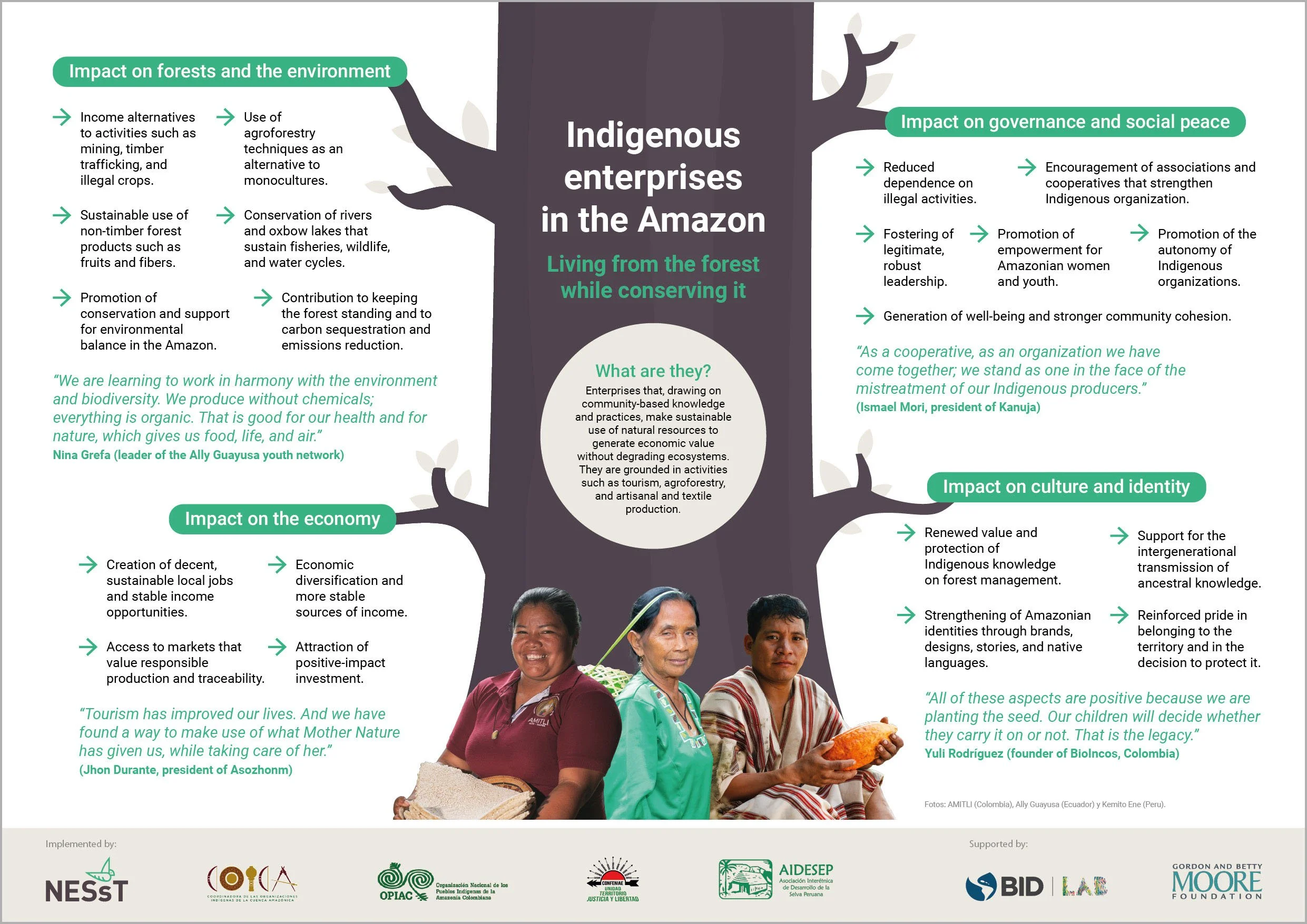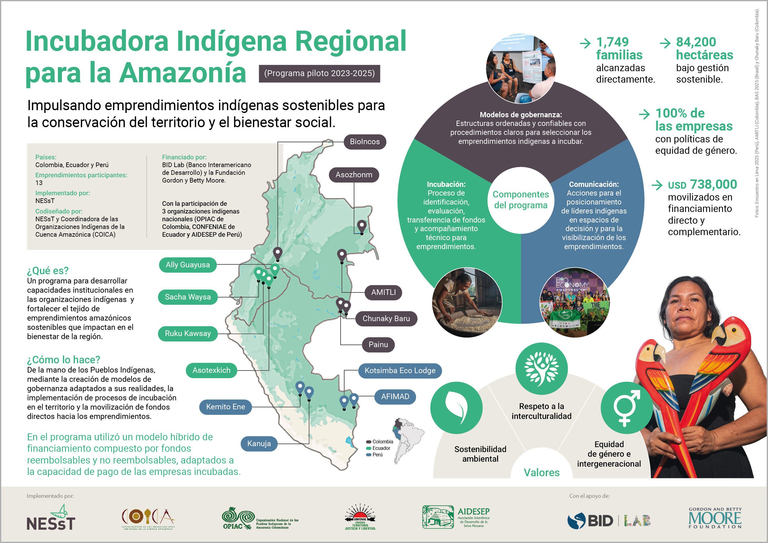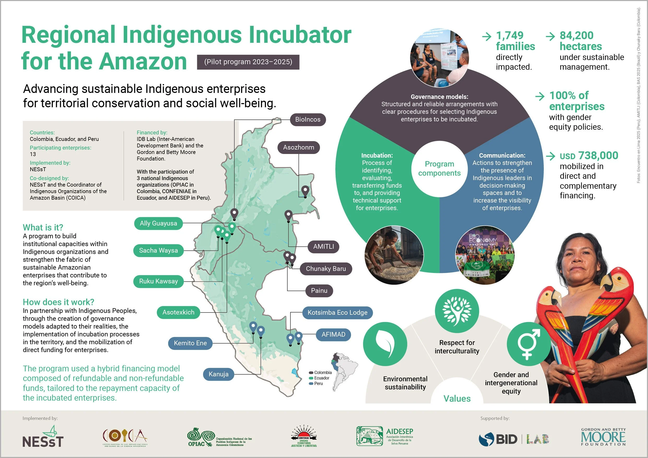 NESsT: The lead organization driving and managing the project. It designed and implemented the Indigenous incubation model together with Amazonian organizations, provided business support and training, and channeled financing to 13 enterprises, adapting business tools to the cultural and territorial context.